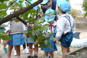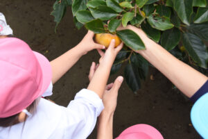 園庭に実った柿を収穫することができました。甘くておいしい柿で、収穫後は秋の味覚を楽しみました。