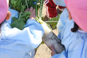 大根の収穫 2026年1月14日 に はごろも幼稚園 が投稿 子ども達が種をまき、観察を楽しんできた大根を収穫することができました。大根は土の中で子ども達が驚くほどに大きく成長していて、友達と力を合わせて一生懸命に大根を引き抜きました。収穫した大根はお昼に美味しくいただきました。